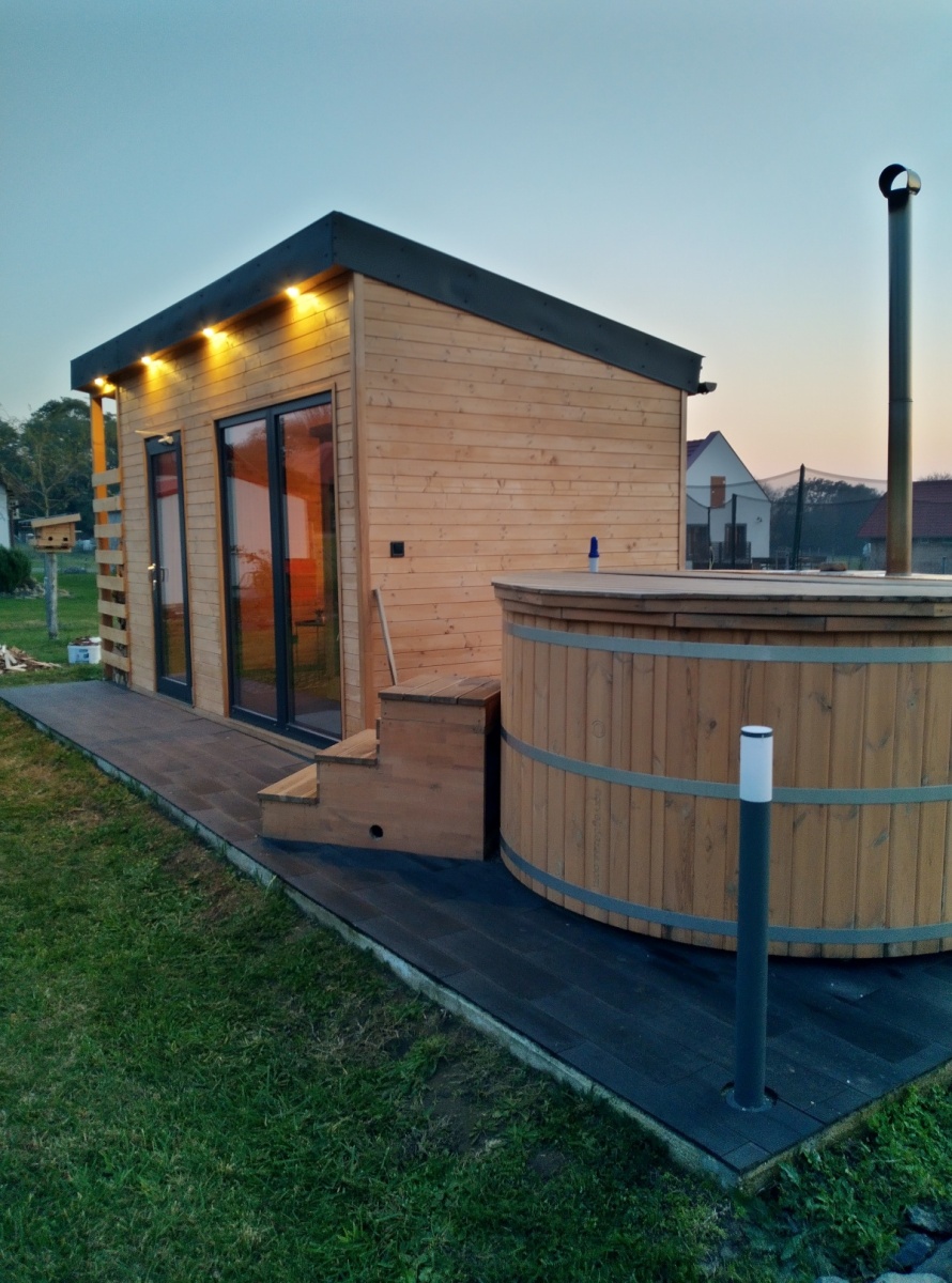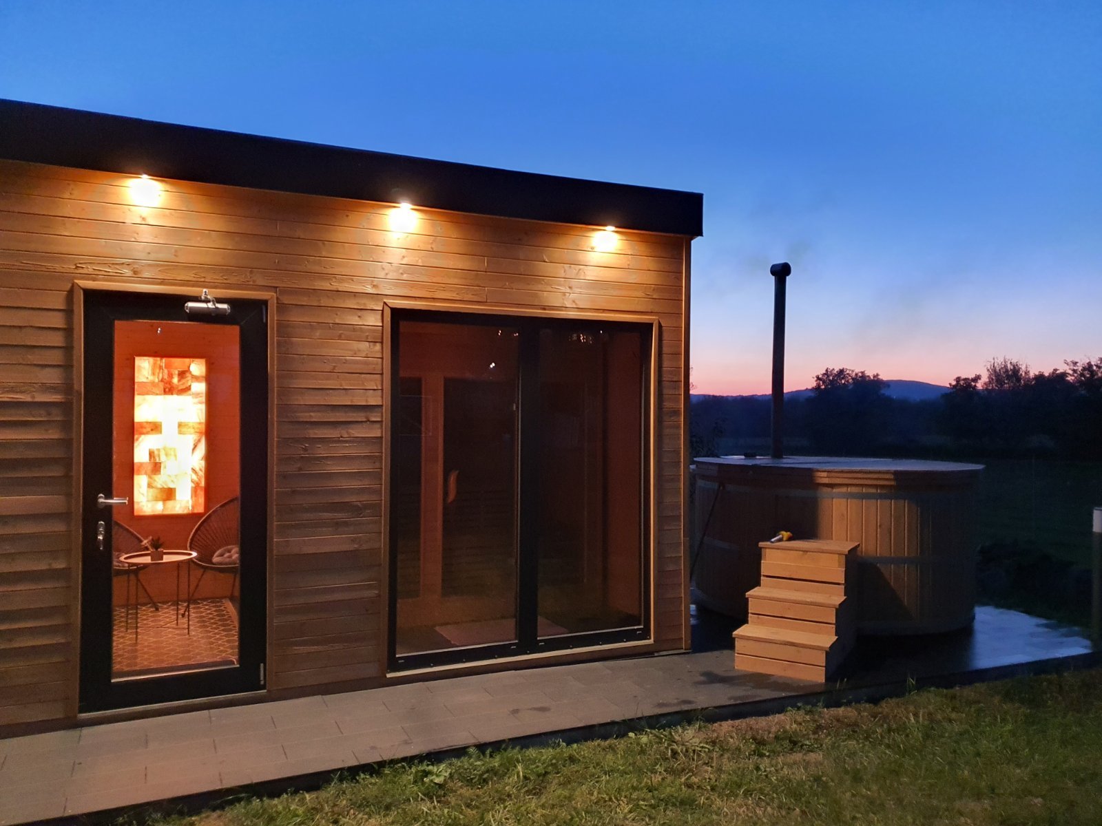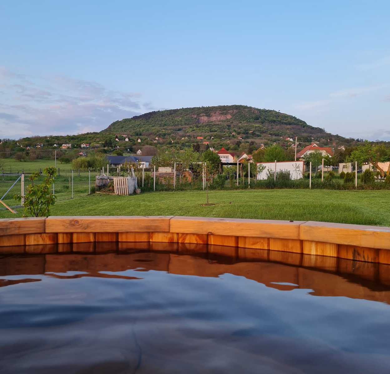 Az udvaron pihenőrésszel ellátott, 4 fő egyidejű kikapcsolódását szolgáló finn szauna található. A szauna mellett nagyméretű dézsafürdő szolgálja egyidejűleg 6-8 fő pihenését. Szaunázás és fürdőzés közben végig gyönyörködni lehet a csodálatos panorámájú Szent György-hegyben.