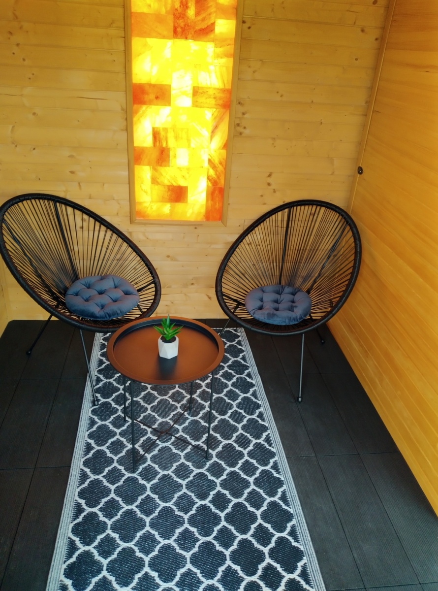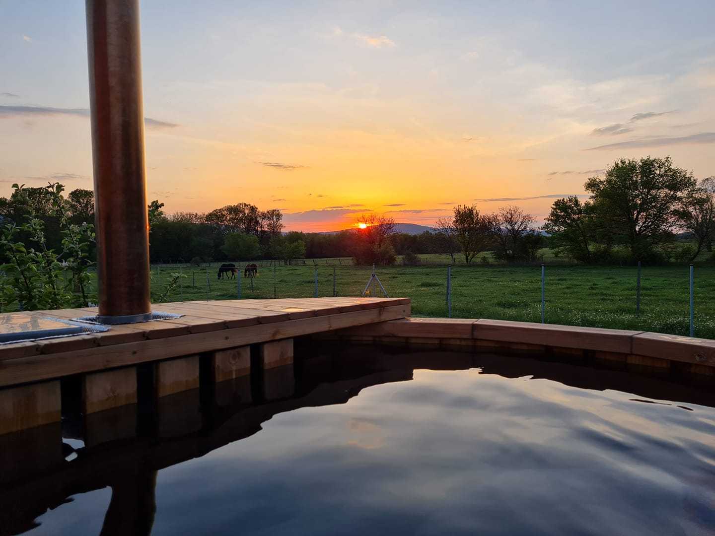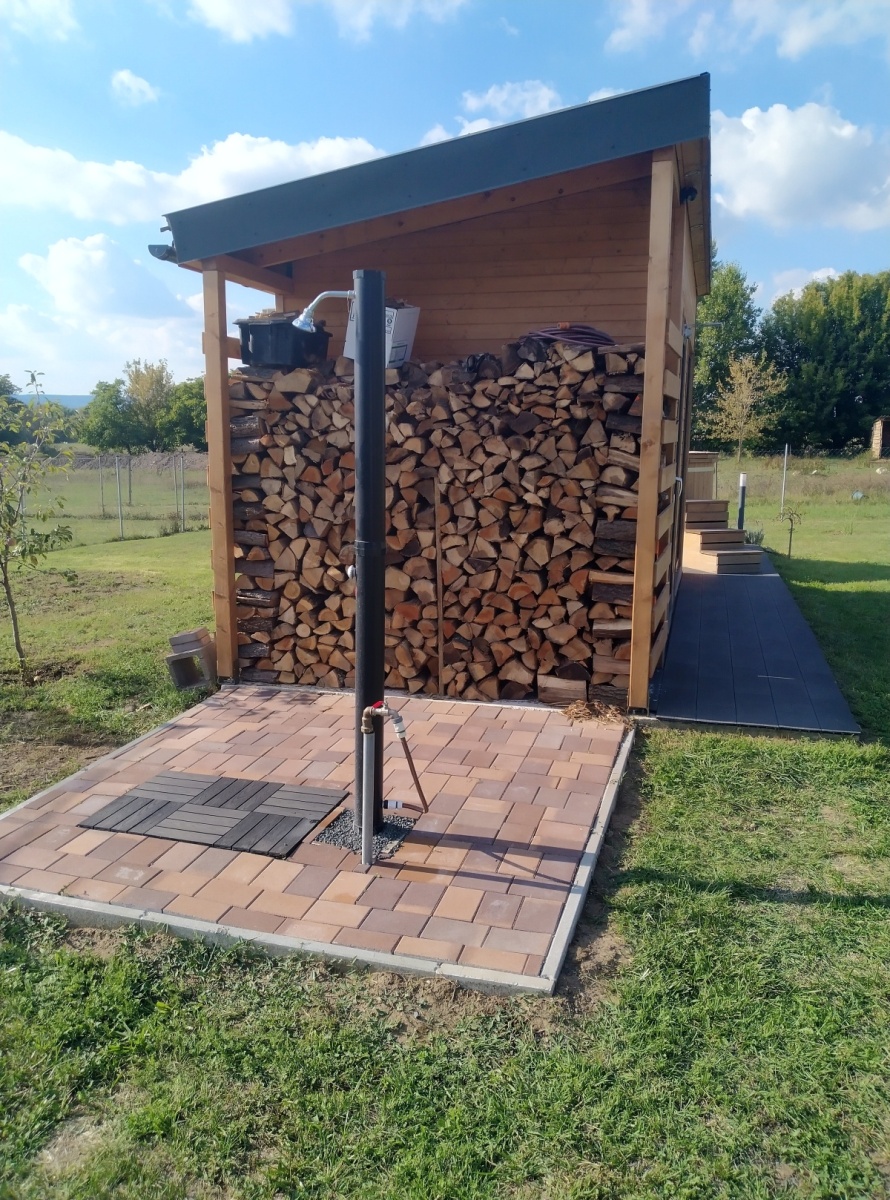 Az udvaron pihenőrésszel ellátott, 4 fő egyidejű kikapcsolódását szolgáló finn szauna található. A szauna mellett nagyméretű dézsafürdő szolgálja egyidejűleg 6-8 fő pihenését. Szaunázás és fürdőzés közben végig gyönyörködni lehet a csodálatos panorámájú Szent György-hegyben.
